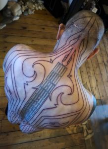 I was approached by well-established tattooist Delphine to schedule an appointment for her partner Adam to create a backpiece for him which would include a cover-up of an existing tattoo down his spine. It’s important when approaching a cover-up that the tattoo is eventually well balanced and not an obvious cover-up. You can read more about my approach to covering tattoos here. Since the completion of Adams back we have started a full torso cover up with the view to a complete bodysuit.