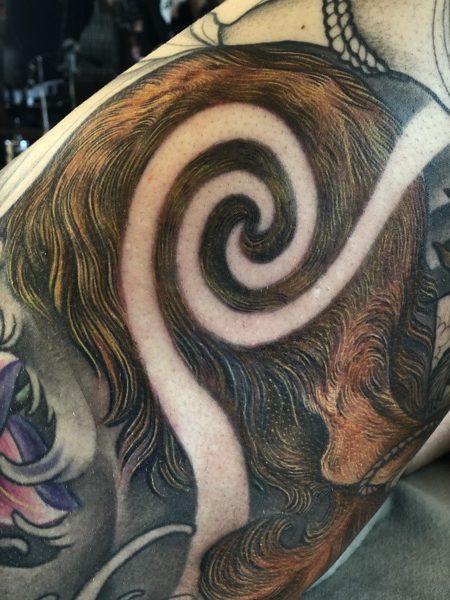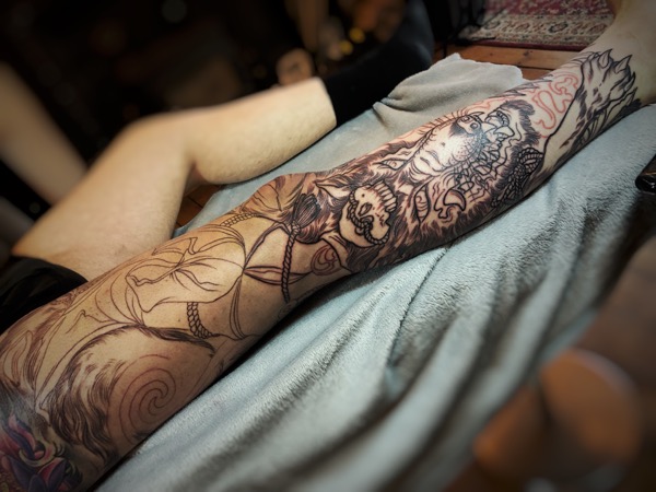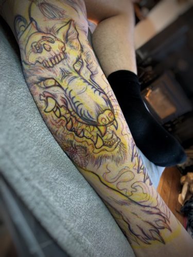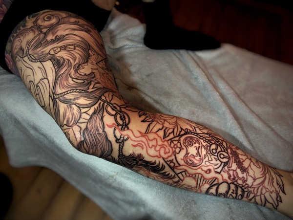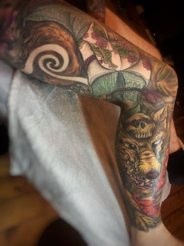 We previously finished his Phoenix front and Fu Dog backpiece in less than a year. Now we have completed his Japanese Kitsune tattoo as a full leg sleeve. Although we are working on a bodysuit, we have sectioned his body up to complete section by section, planning tie-ins and flows from one body part to another to make the bodysuit seamless. This is an essential part of planning a tattoo for me. Not everyone comes to me wanting a bodysuit like Kris, but many people progress to that over years. I want every tattoo to be extendable seamlessly into a bodysuit. That takes thought and consideration, so as not to make a blunt end or area that won’t flow well if extended.