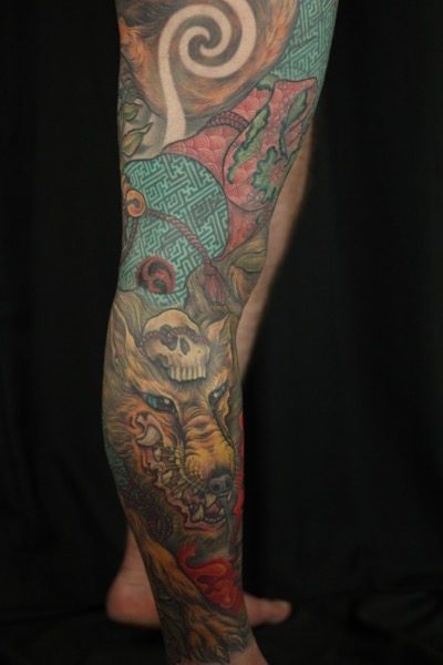 I am very excited to share with you the finished project. Kris’s Japanese Kitsune leg sleeve with colourful geometric robes. A crazy technical endeavour that I’m sure you will agree, was worth the work and eye strain!!!