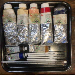 • The brand of oil paint I use is Old holland, they are expensive but they have a great amount of pigment in, so I can get very rich intense colours without piling on the paint! Something close to these will be great, I have put in brackets what I think could be equivalent in Georgian and some pics to try to help you colour match! I use mixed white, yellow medium, flesh tint, madder crimson lake deep extra (alizarin crimson), indigo extra (Prussian blue), burnt umber, French ultramarine light extra, transparent oxide yellow lake. I don’t use black, but it could be handy if your colours are a lot lighter than mine. You will also need some sort of Pallette.